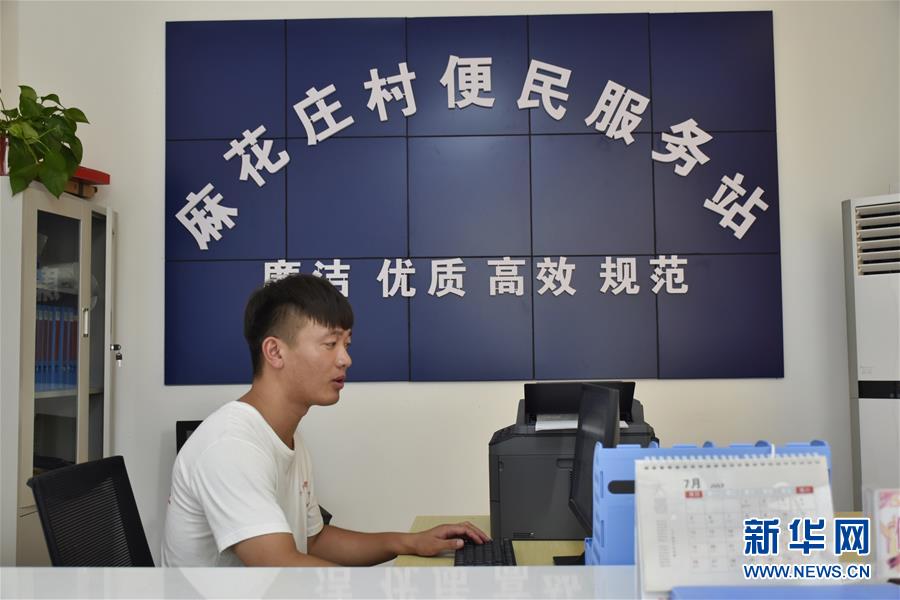 7月8日,張亞博在麻花莊村便民服務(wù)站整理資料。新華社記者韓朝陽(yáng)攝