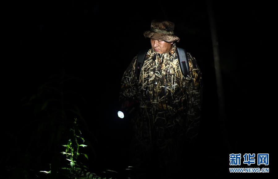 董紅雨在迎春林業(yè)局有限公司施業(yè)區(qū)內(nèi)進行野生東北虎信息搜集和夜巡工作(7月8日攝)。新華社記者王松攝