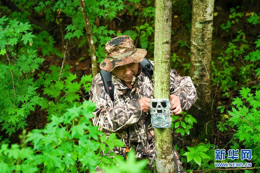董紅雨在迎春林業(yè)局有限公司施業(yè)區(qū)內(nèi)查看架設(shè)在樹上用于拍攝野生東北虎蹤跡的遠(yuǎn)紅外相機(7月8日攝)。新華社記者王松攝