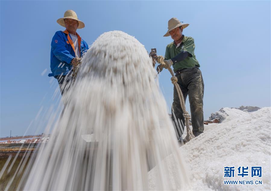 7月9日,唐山市曹妃甸區(qū)南堡鹽場的工人將收獲的春鹽裝船。在我國長蘆鹽區(qū)海鹽生產(chǎn)基地之一的河北省唐山市曹妃甸區(qū)南堡鹽場,一年一度的春鹽收獲工作即將結束,今年南堡鹽場的春鹽產(chǎn)量預計可達72萬噸。新華社記者楊世堯攝