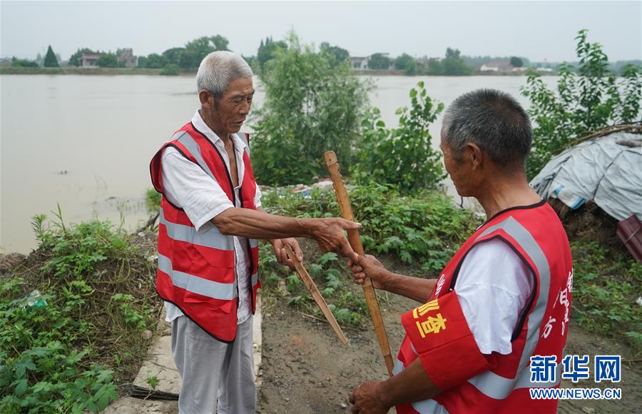 7月9日,在高淳區(qū)陽江鎮(zhèn)永豐圩,巡堤員在進(jìn)行“水牌”(巡堤查險(xiǎn)責(zé)任牌)交接。新華社記者季春鵬攝