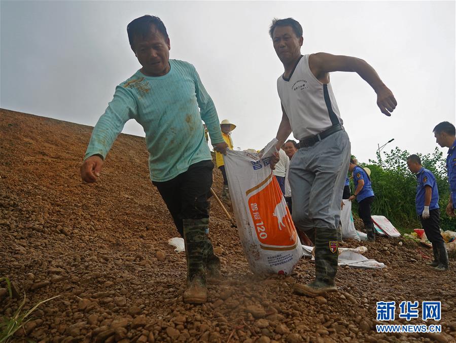 7月9日,邵忠如(前左二)和村民們裝填沙袋,封堵圩堤上的泡泉。新華社記者萬(wàn)象攝