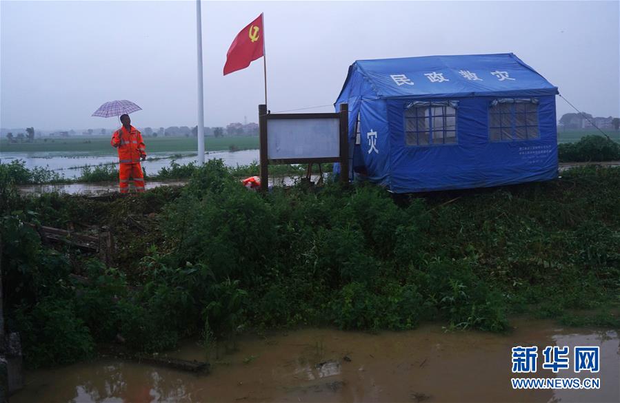 7月9日,邵忠如在圩堤上的救災(zāi)棚旁觀察水情。新華社記者萬(wàn)象攝