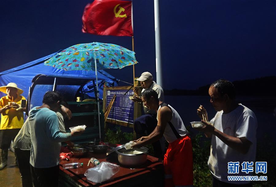 7月9日,邵忠如(右二)和村民一起在圩堤上冒雨吃晚飯。新華社記者萬(wàn)象攝