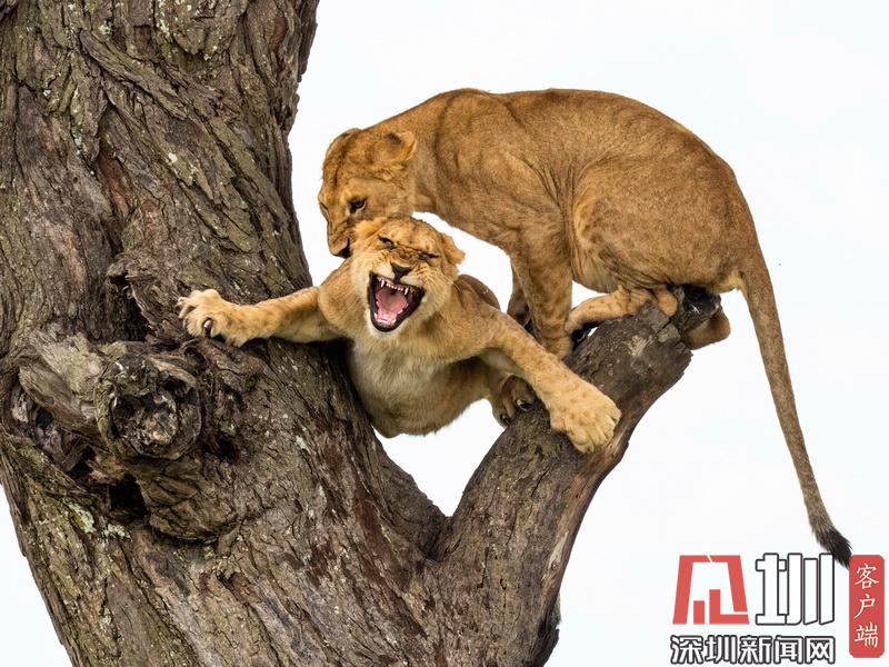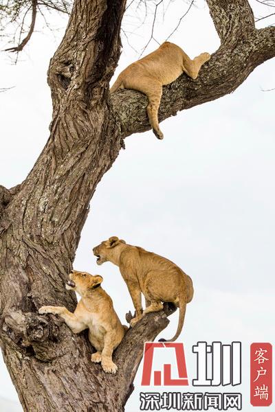 2020年7月13日?qǐng)?bào)道(具體拍攝時(shí)間不詳),Sandesh Kadur是一名印度野生動(dòng)物攝影師,他在坦桑尼亞塞倫蓋蒂國家公園拍攝到一系列“獅子上樹”的精彩照片。畫面中,有一只憤怒的母獅為了捍衛(wèi)自己在樹上的位置,一邊劈叉一邊對(duì)著鏡頭咆哮,有兩只獅子為了爭奪位置互相攻擊,還有一只獅子在找到舒適的位置后呼呼大睡。