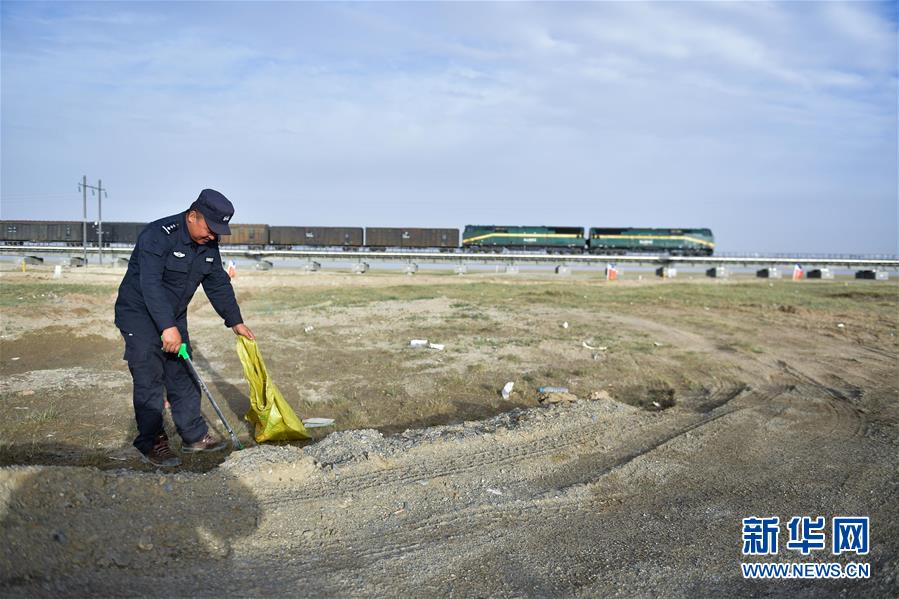 在可可西里索南達杰保護站附近青藏鐵路沿線,龍周才加在撿拾垃圾(6月30日攝)。新華社記者 張龍 攝