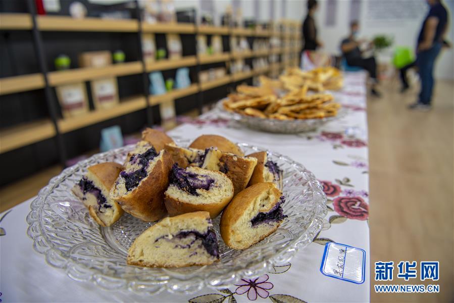 7月13日在新疆精河縣精河鎮(zhèn)馕文化產(chǎn)業(yè)示范基地拍攝的供顧客品嘗的“黑枸杞馕”。近日,新疆精河縣10萬余畝枸杞陸續(xù)成熟,當(dāng)?shù)剞r(nóng)民搶抓農(nóng)時,采收枸杞。近年來,精河縣持續(xù)發(fā)展和培育枸杞“紅色產(chǎn)業(yè)鏈”,加大資金扶持力度,提升精河枸杞的品牌效應(yīng),帶動農(nóng)民增收致富。精河縣位于新疆天山山脈北麓,準(zhǔn)噶爾盆地西南邊緣。當(dāng)?shù)厝照諘r間長、晝夜溫差大且氣候干燥,有利于枸杞果實糖分和藥用成分積累。新華社記者 胡虎虎 攝