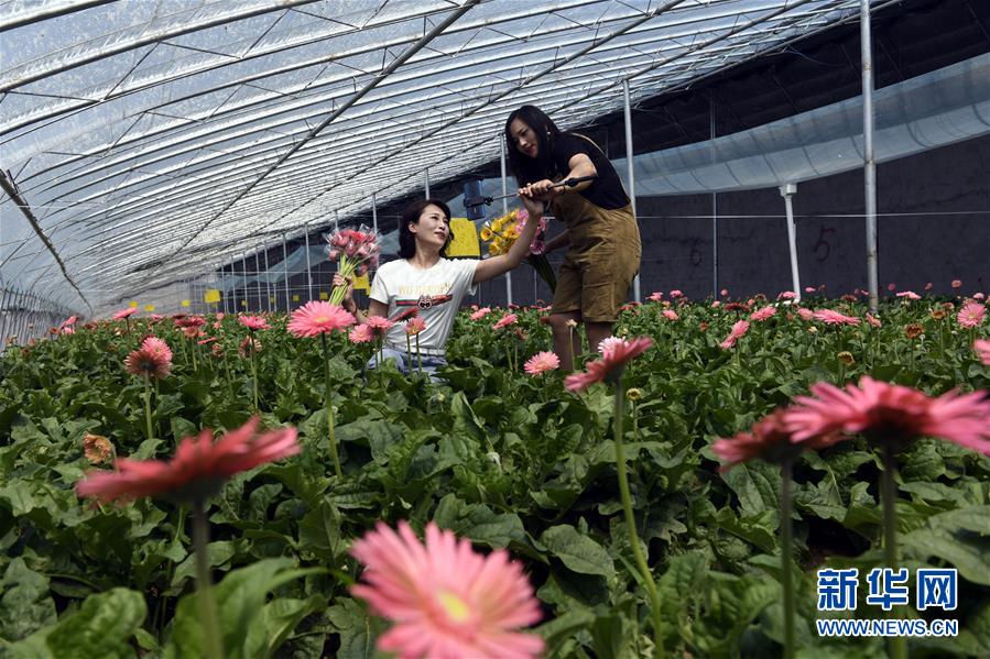 7月10日,在莒縣招賢鎮(zhèn)西黃埠村盛世花卉種植專業(yè)合作社,駐村第一書記鐘翠娟(左)在扶郎花種植大棚進(jìn)行網(wǎng)上直播。山東省日照市莒縣招賢鎮(zhèn)有20余年的玫瑰花、扶郎花種植歷史。目前,招賢鎮(zhèn)投資建設(shè)的高標(biāo)準(zhǔn)特色鮮花種植大棚可年產(chǎn)700-800萬(wàn)枝優(yōu)質(zhì)玫瑰和扶郎花等,帶動(dòng)周邊鄉(xiāng)鎮(zhèn)的建檔立卡貧困戶脫貧增收。新華社記者 范長(zhǎng)國(guó) 攝