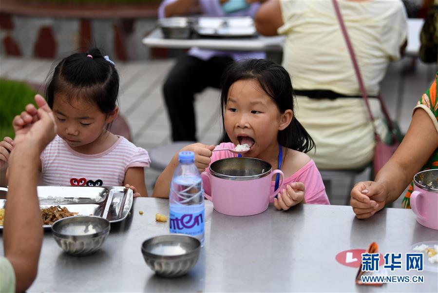 7月14日,小朋友在宿松縣洲頭鄉(xiāng)中心小學集中安置點吃晚餐。近日,安徽省宿松縣洲頭鄉(xiāng)泗洲村的300多名村民因洪水被轉(zhuǎn)移到該鄉(xiāng)中心小學集中安置點。安置點工作人員、志愿者利用學校食堂為村民們烹飪飯菜,讓村民們在安置點吃上熱騰騰的三餐。新華社記者 劉軍喜 攝