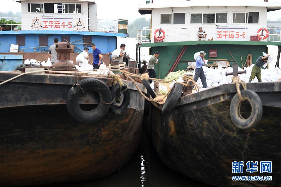 7月14日,當(dāng)?shù)卮迕裢簧习徇\(yùn)砂石袋。近日,受洪水影響,安徽省望江縣華陽鎮(zhèn)境內(nèi)的江調(diào)圩內(nèi)部道路漫水,搶險(xiǎn)車輛無法進(jìn)入。當(dāng)?shù)胤姥床块T組織船只裝載砂石袋等防汛物資,運(yùn)往圩堤保防汛。新華社記者 劉軍喜 攝