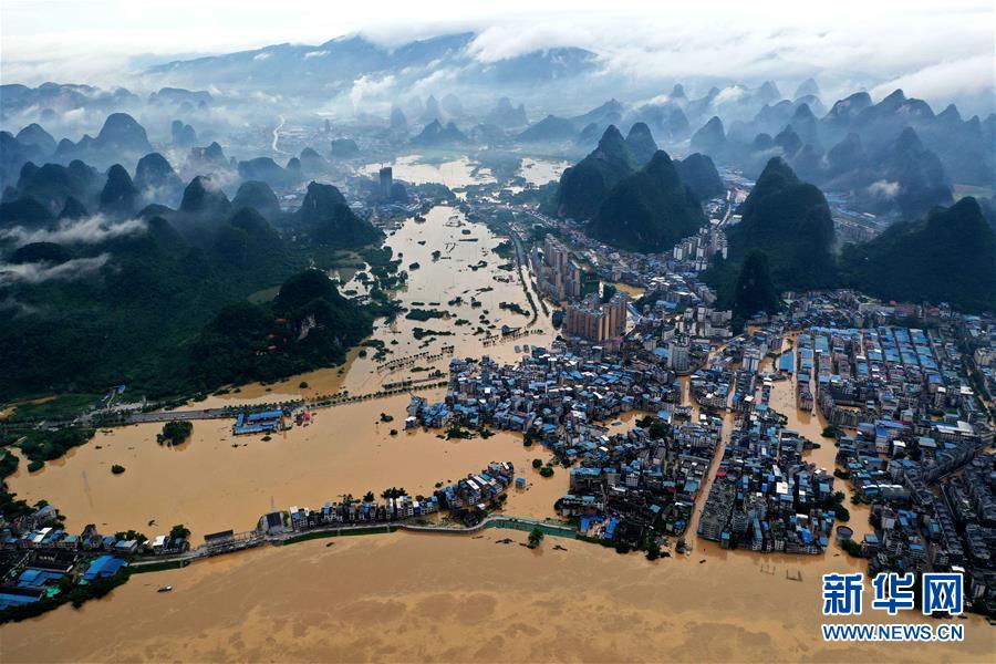 7月11日在廣西柳州市融水苗族自治縣拍攝的融江(無(wú)人機(jī)照片)。受連日強(qiáng)降雨影響,廣西柳州市融水苗族自治縣融江出現(xiàn)超警戒水位。新華社記者黃孝邦攝