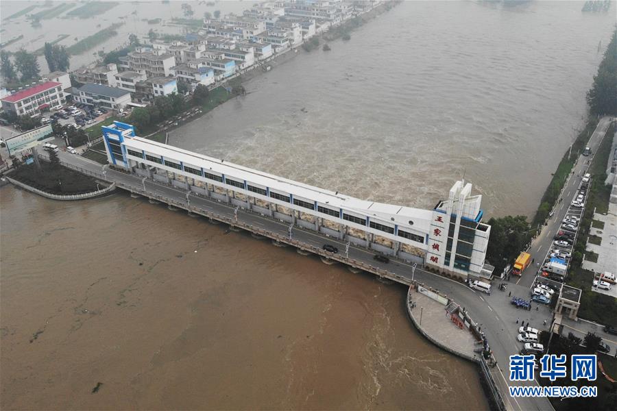 7月20日,洪水通過(guò)王家壩閘涌入蒙洼蓄洪區(qū)(無(wú)人機(jī)照片)。當(dāng)日8時(shí)32分,淮河干流王家壩閘開(kāi)閘泄洪。受近期強(qiáng)降雨影響,淮河干流王家壩站水位19日快速上漲,7月20日6時(shí)36分水位漲至29.66米,超過(guò)保證水位0.36米?;春油跫覊伍l開(kāi)閘泄洪,蒙洼蓄洪區(qū)啟用。新華社記者黃博涵攝