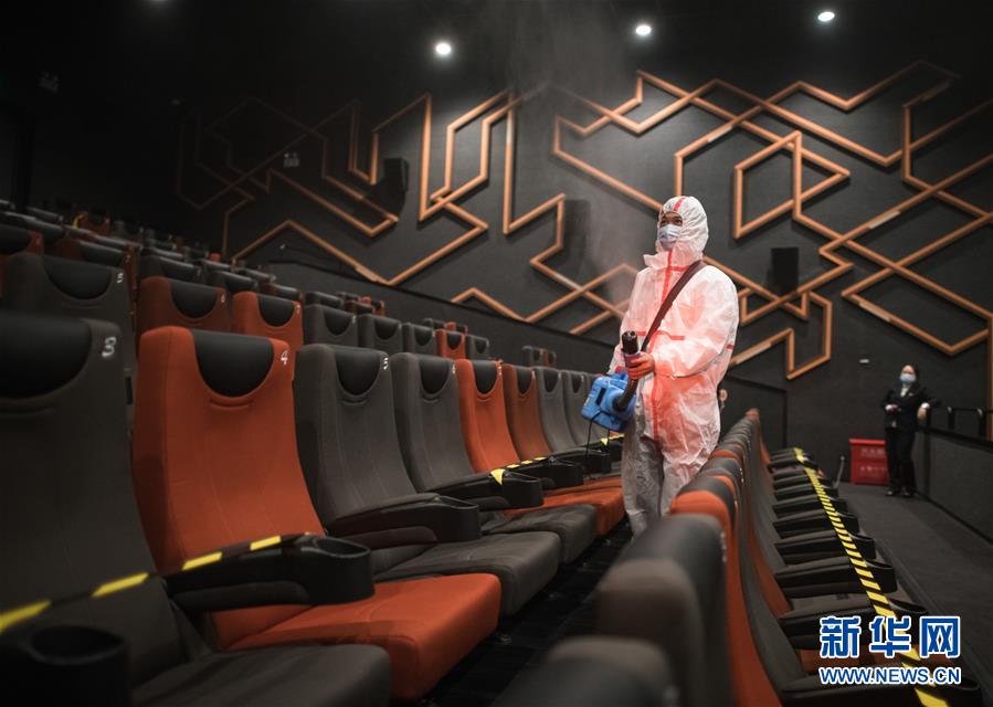 7月20日,武漢一家影院工作人員開展消殺作業(yè)。當(dāng)日,在各項(xiàng)疫情防控措施有效落實(shí)到位的前提下,武漢市部分電影院恢復(fù)開放。新華社記者肖藝九攝