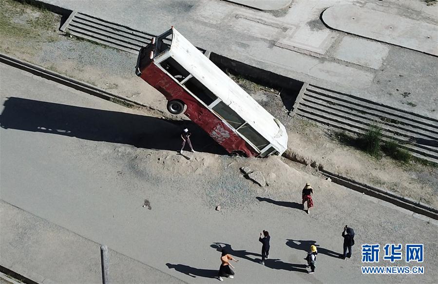 2019年8月23日,游客在阿克塞老縣城一處因拍攝電影而設(shè)置的景觀前拍照(無人機(jī)照片)。