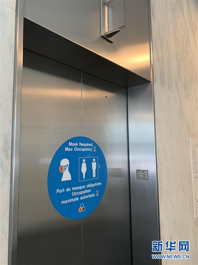 7月20日,在位于紐約的聯合國總部,電梯門上張貼著要求人們在公共場所佩戴口罩等標識。受新冠疫情影響而實行遠程辦公4個多月的紐約聯合國總部20日進入重啟第一階段。按規(guī)定,該階段每天進入總部大樓人數不能超過400人。新華社記者王建剛攝