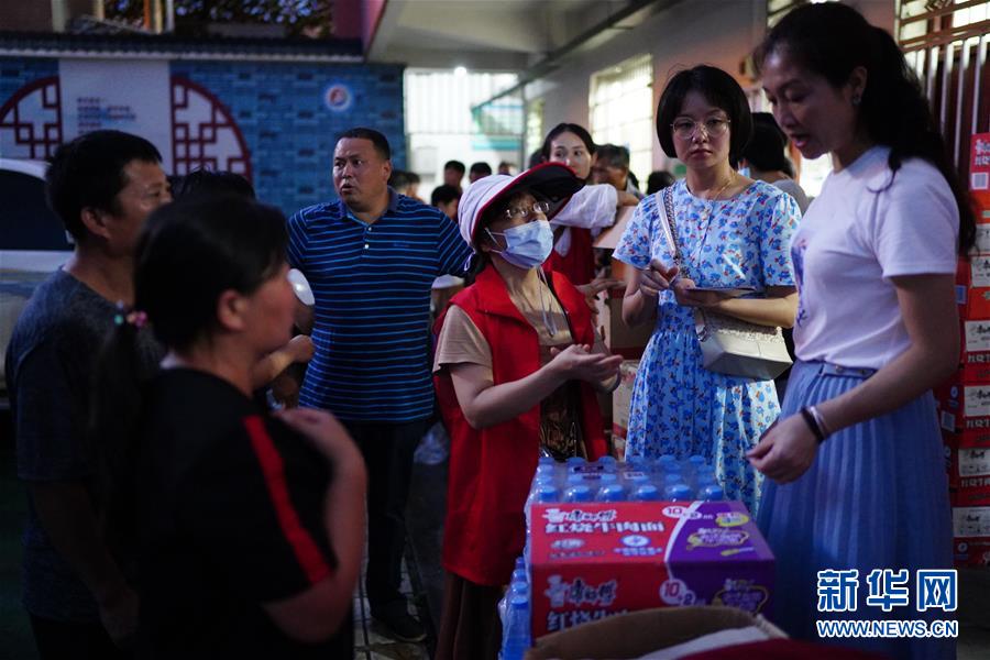 7月9日,在江西鄱陽縣鄱陽鎮(zhèn)集中安置點,志愿者和工作人員為村民分配物資。新華社記者周密攝