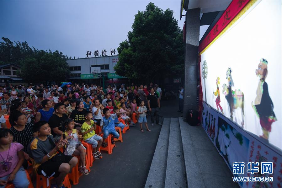 7月21日,和睦橋村的村民們?cè)谖幕Y堂觀看皮影戲表演。新華社記者徐昱攝