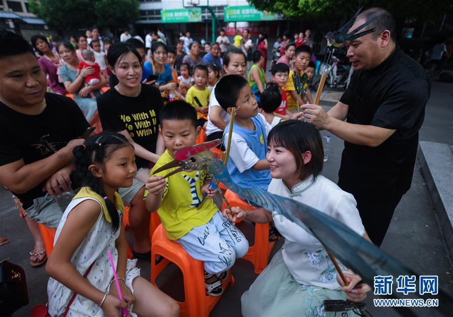 當(dāng)日,浙江省杭州市余杭區(qū)塘棲鎮(zhèn)河西埭村“衛(wèi)家班皮影戲”劇團(tuán)的藝人們來(lái)到余杭區(qū)喬司街道和睦橋村進(jìn)行演出,這是近期杭州市余杭區(qū)夏季鄉(xiāng)村“文化走親”的重要活動(dòng)之一。今年6月開(kāi)始,杭州市余杭區(qū)塘棲鎮(zhèn)組織多支文化表演團(tuán)體以“文化走親”的形式,先后送戲到余杭區(qū)近20個(gè)鄉(xiāng)村文化禮堂,豐富夏日鄉(xiāng)村百姓文化生活。在余杭塘棲一帶,歷史上曾活躍著一支以演出皮影戲出名的民間戲班子,號(hào)稱“衛(wèi)家班”。2016年,塘棲鎮(zhèn)河西埭村在文化禮堂的建設(shè)過(guò)程中,將當(dāng)?shù)貍鹘y(tǒng)的“衛(wèi)家班皮影戲”作為“一村一品”特色項(xiàng)目進(jìn)行了搶救性保護(hù)。2018年12月,“衛(wèi)家班皮影戲”被列入杭州市非物質(zhì)文化遺產(chǎn)代表性項(xiàng)目名錄。新華社記者徐昱攝