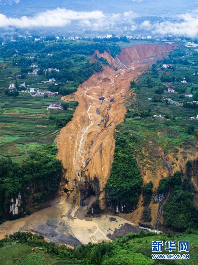7月22日拍攝的因恩施州屯堡鄉(xiāng)馬者村山體滑坡形成的堰塞湖(無人機照片)。