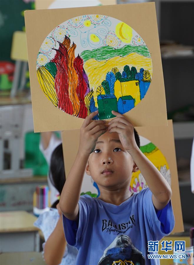 7月23日,在廬山市蛟塘鎮(zhèn)中心小學安置點,一名小朋友展示自己的繪畫作品。新華社記者張浩波攝
