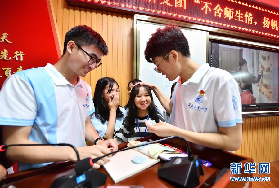 在融水苗族自治縣思源實驗學(xué)校舉辦的支教團(tuán)送別晚會上,支教老師譚博天(右一)和徐晨曦(左一)收到同學(xué)們的寄語卡片(7月22日攝)。
