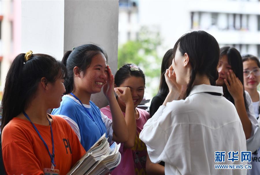 在融水苗族自治縣民族中學(xué)1818班舉辦的送別班會(huì)上,同學(xué)們與支教老師高潔(前右)道別(7月23日攝)。新華社記者黃孝邦攝