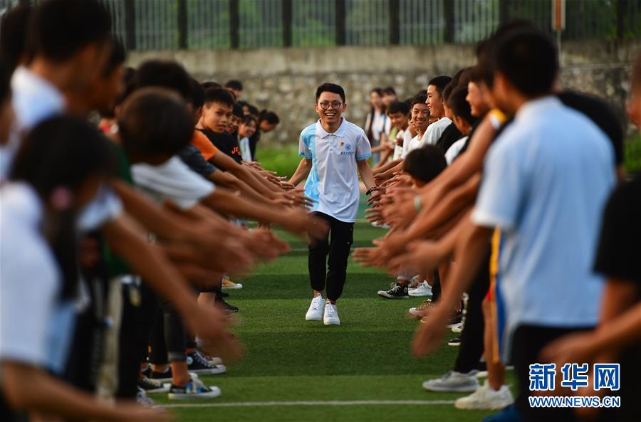 在融水苗族自治縣思源實驗學校舉辦的支教團送別晚會上,支教老師溫昌浩(中)接受同學們的祝福(7月22日攝)。新華社記者黃孝邦攝