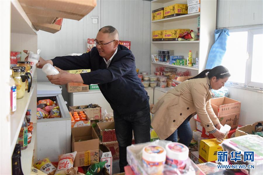 在索爾庫(kù)里宿營(yíng)地,鐵路工人趙桂建(左)幫助妻子整理“白皮列車(chē)”上平價(jià)商店的商品(7月19日攝)。新華社記者 丁磊 攝