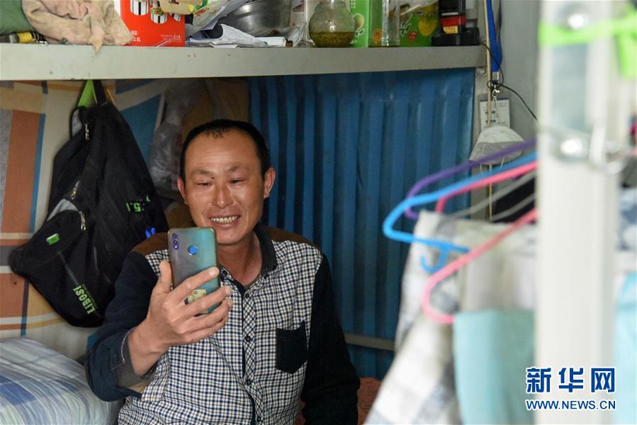 中鐵一局的施工人員在“白皮列車”內(nèi)與家人聯(lián)絡(luò)(7月19日攝)。新華社記者 丁磊 攝