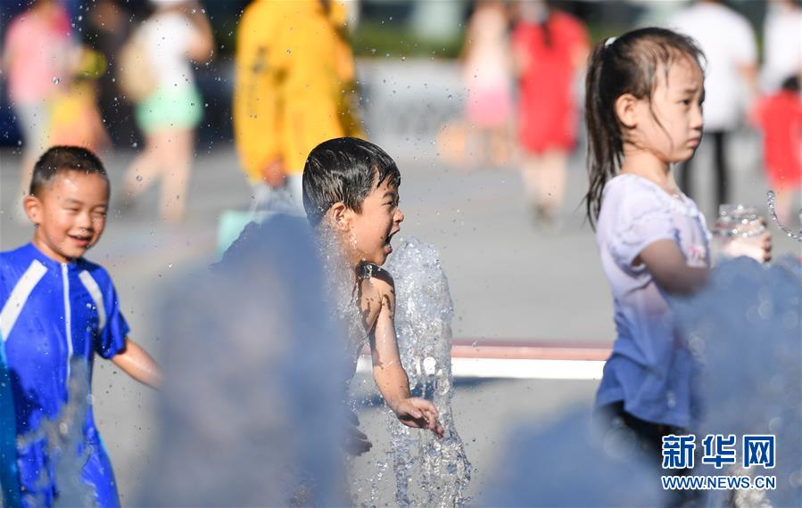 7月24日,孩子們在北京華熙LIVE·五棵松商業(yè)街區(qū)的一處噴泉戲水。北京市氣象局7月24日傍晚發(fā)布稱,24日截至16時(shí)30分,平原大部分地區(qū)出現(xiàn)37℃以上高溫天氣,局地氣溫超過40℃。北京市已于23日發(fā)布高溫藍(lán)色預(yù)警,預(yù)計(jì)25日全市大部分地區(qū)日最高氣溫仍將達(dá)35℃以上。新華社記者陳曄華攝