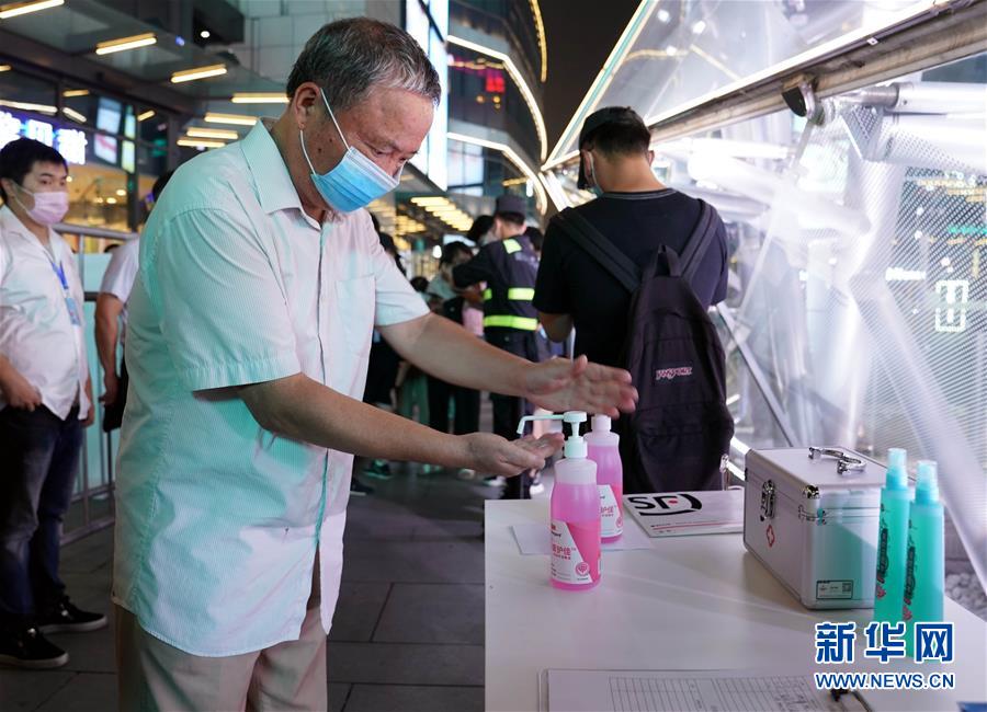 7月25日,在上海大寧音樂廣場(chǎng),觀看露天電影展映的觀眾在入場(chǎng)前清潔手部。新華社記者 劉穎 攝