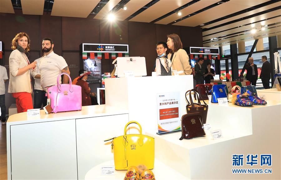 2020年5月8日,虹橋品匯國(guó)別文化節(jié)云游意大利主題展在上海虹橋進(jìn)口商品展示交易中心舉行,參觀者從展覽上一個(gè)意大利皮具展示臺(tái)前走過(guò)。新華社記者 方喆 攝