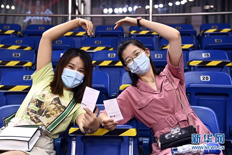 7月26日,在青島國信體育館,兩位現(xiàn)場觀看比賽的觀眾展示著自己的紙質(zhì)球票。當(dāng)日,在山東青島舉行的2019-2020賽季中國男子籃球職業(yè)聯(lián)賽(CBA)復(fù)賽第二階段(嶗山賽區(qū))比賽中,醫(yī)護(hù)人員、教師、公安戰(zhàn)線人士通過官方購票平臺,完成包括核酸檢測在內(nèi)的相關(guān)流程后進(jìn)場觀看了上海久事隊迎戰(zhàn)山東西王隊的比賽。觀賽期間,觀賽者須全程佩戴口罩,對號入座,嚴(yán)格保持間隔一米就座。退場時,觀眾須按照自后向前、先兩邊后中間的順序,保持“一米線”社交距離有序退場。新華社記者 郭緒 雷攝