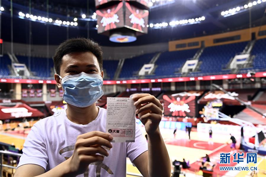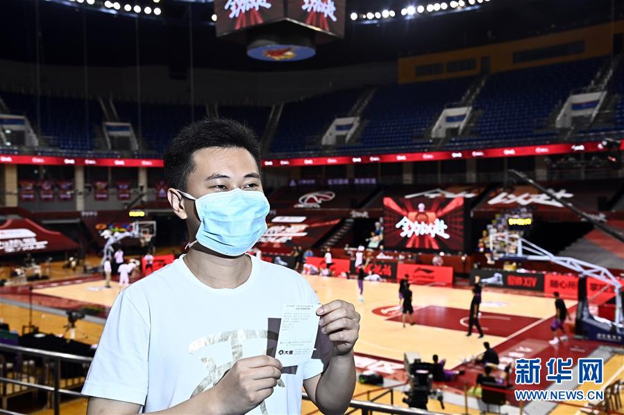 7月26日,在青島國信體育館,蘇柯帆展示著自己的紙質(zhì)球票。他成為CBA聯(lián)賽復(fù)賽允許觀眾現(xiàn)場觀賽后,首位進(jìn)場的觀眾。當(dāng)日,在山東青島舉行的2019-2020賽季中國男子籃球職業(yè)聯(lián)賽(CBA)復(fù)賽第二階段(嶗山賽區(qū))比賽中,醫(yī)護(hù)人員、教師、公安戰(zhàn)線人士通過官方購票平臺,完成包括核酸檢測在內(nèi)的相關(guān)流程后進(jìn)場觀看了上海久事隊迎戰(zhàn)山東西王隊的比賽。觀賽期間,觀賽者須全程佩戴口罩,對號入座,嚴(yán)格保持間隔一米就座。退場時,觀眾須按照自后向前、先兩邊后中間的順序,保持“一米線”社交距離有序退場。新華社記者 郭緒雷 攝