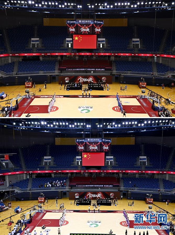 拼版照片的上圖為7月26日遼寧本鋼隊對陣四川五糧金樽隊的比賽現(xiàn)場;下圖為7月26日上海久事隊對陣山東西王隊的比賽現(xiàn)場,該場比賽首次恢復(fù)觀眾現(xiàn)場觀看比賽。當(dāng)日,在山東青島舉行的2019-2020賽季中國男子籃球職業(yè)聯(lián)賽(CBA)復(fù)賽第二階段(嶗山賽區(qū))比賽中,醫(yī)護人員、教師、公安戰(zhàn)線人士通過官方購票平臺,完成包括核酸檢測在內(nèi)的相關(guān)流程后進場觀看了上海久事隊迎戰(zhàn)山東西王隊的比賽。觀賽期間,觀賽者須全程佩戴口罩,對號入座,嚴(yán)格保持間隔一米就座。退場時,觀眾須按照自后向前、先兩邊后中間的順序,保持“一米線”社交距離有序退場。新華社記者 郭緒雷 攝