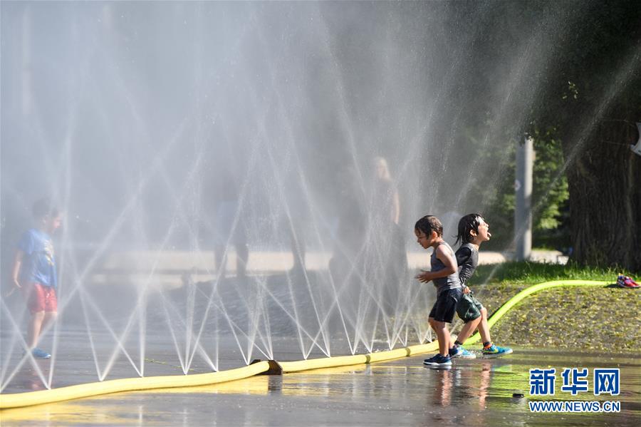 7月28日,在奧地利維也納,兒童在一處廣場(chǎng)戲水。新華社記者郭晨攝