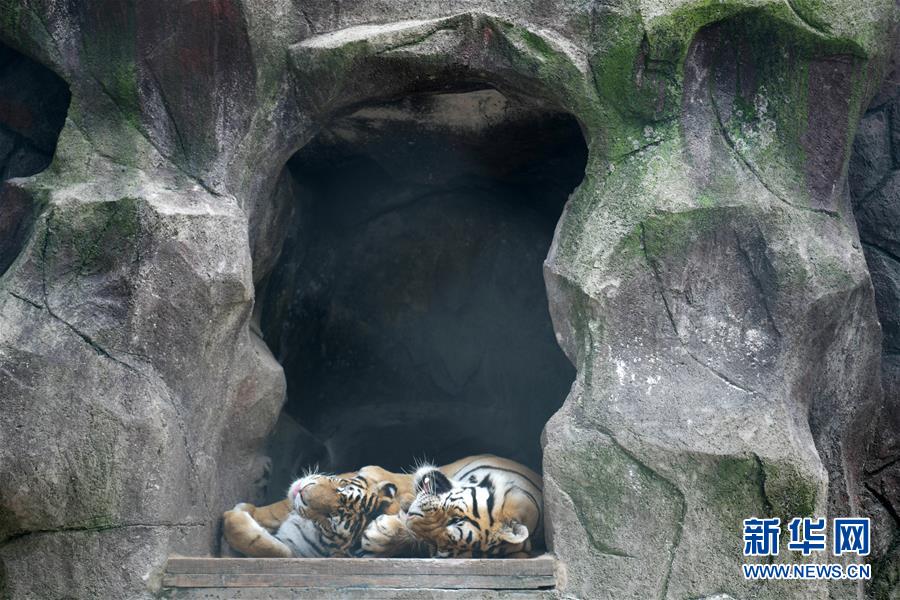 在橫道河子?xùn)|北虎林園,東北虎在休息(7月27日攝)。時(shí)值盛夏,位于黑龍江省海林市的橫道河子?xùn)|北虎林園的東北虎活動(dòng)量減少,以不同方式消夏納涼。新華社記者王建威攝