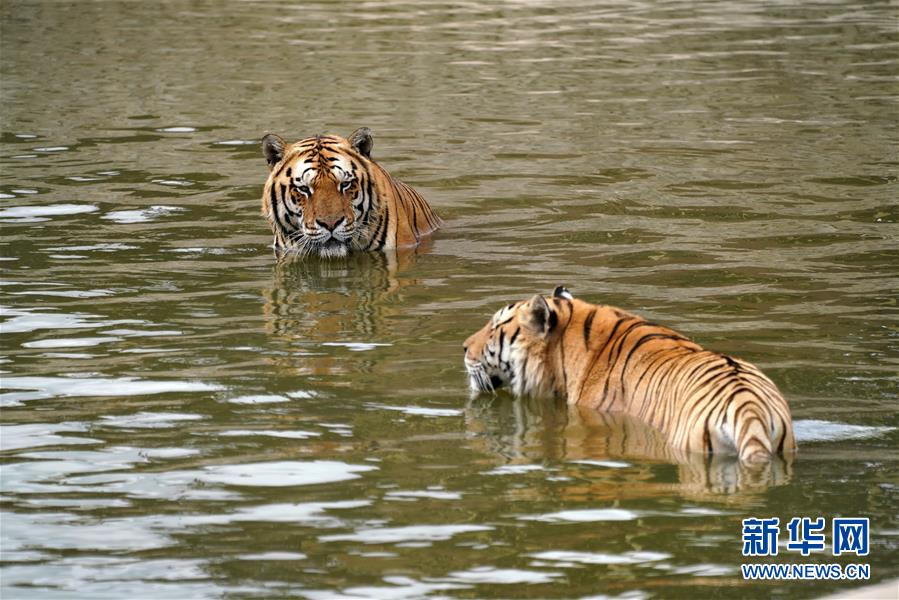 7月28日,在橫道河子?xùn)|北虎林園,東北虎在水中納涼。時(shí)值盛夏,位于黑龍江省海林市的橫道河子?xùn)|北虎林園的東北虎活動(dòng)量減少,以不同方式消夏納涼。新華社記者王建威攝