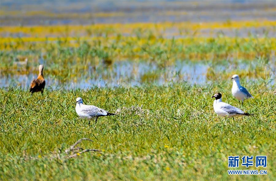 7月28日,灰雁和遺鷗在桃力廟—阿拉善灣海子覓食。鄂爾多斯?jié)竦匚挥趲觳箭R沙漠、毛烏素沙地接壤地帶,2002年被列入國際重要濕地名錄。從2006年開始,由于濕地湖面萎縮、湖心島消失,在此筑巢繁殖的世界瀕危物種遺鷗幾近消失。近年來,當(dāng)?shù)夭扇《喾N治理措施,濕地生態(tài)環(huán)境逐步好轉(zhuǎn)。2019年起,濕地內(nèi)的桃力廟—阿拉善灣海子迎來遺鷗大規(guī)模“回歸”。如今,40多種鳥類在此棲息,鄂爾多斯?jié)竦刂匦鲁蔀轼B類的樂園。新華社記者彭源攝