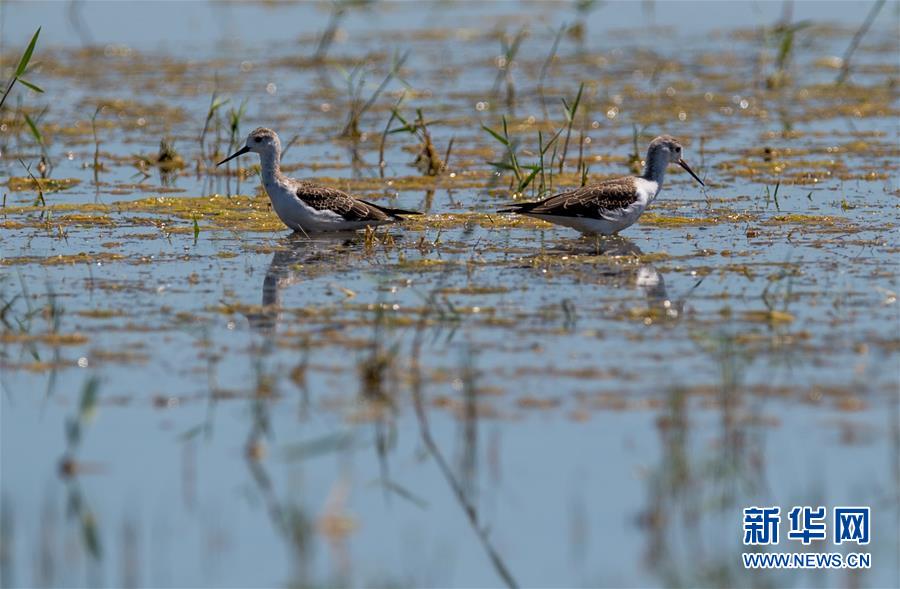 7月28日,兩只長腳鷸在桃力廟—阿拉善灣海子覓食。鄂爾多斯?jié)竦匚挥趲觳箭R沙漠、毛烏素沙地接壤地帶,2002年被列入國際重要濕地名錄。從2006年開始,由于濕地湖面萎縮、湖心島消失,在此筑巢繁殖的世界瀕危物種遺鷗幾近消失。近年來,當?shù)夭扇《喾N治理措施,濕地生態(tài)環(huán)境逐步好轉。2019年起,濕地內(nèi)的桃力廟—阿拉善灣海子迎來遺鷗大規(guī)?!盎貧w”。如今,40多種鳥類在此棲息,鄂爾多斯?jié)竦刂匦鲁蔀轼B類的樂園。新華社記者連振攝