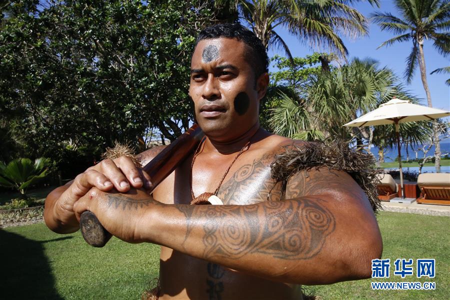 7月21日,在斐濟(jì)首都蘇瓦附近的納努庫(kù)奧博格海邊度假村,一名斐濟(jì)“武士”迎接游客。