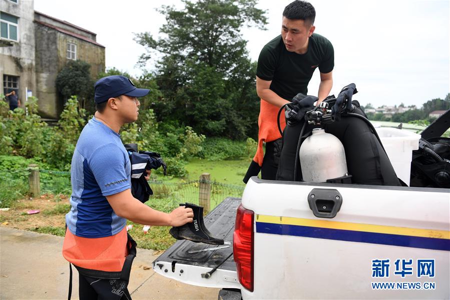 7月24日,徐宏林(左)和吳正寶在安徽省廬江縣臺創(chuàng)園小南河段準備潛水裝備。新華社記者劉軍喜攝