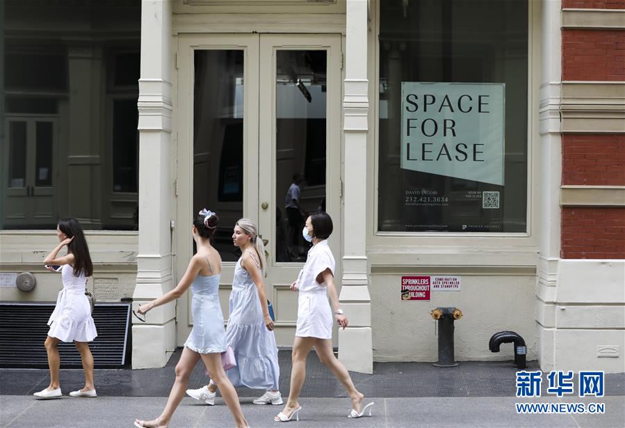 7月30日,在美國紐約蘇豪商業(yè)區(qū),人們從一家招租的店面旁走過。美國商務(wù)部30日公布的首次預估數(shù)據(jù)顯示,受新冠疫情導致經(jīng)濟大面積“停擺”和消費停滯拖累,今年第二季度美國實際國內(nèi)生產(chǎn)總值(GDP)按年率計算下滑32.9%,創(chuàng)1947年有記錄以來最大降幅。新華社記者王迎攝