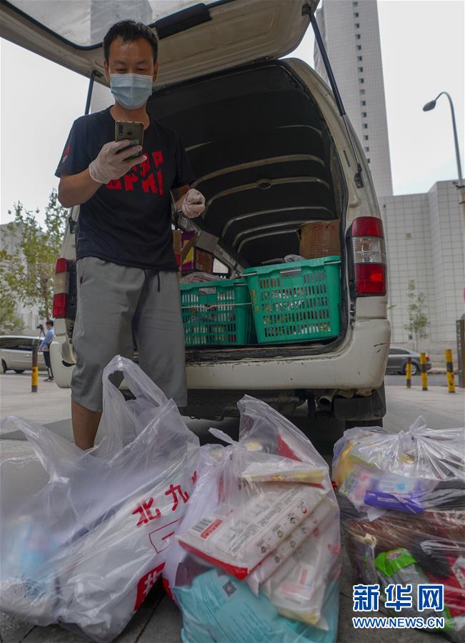 7月30日,在烏魯木齊經(jīng)濟(jì)技術(shù)開發(fā)區(qū)(頭屯河區(qū))天鵝湖社區(qū)一家超市,商販按照住戶的訂單配送果蔬。新華社記者趙戈攝