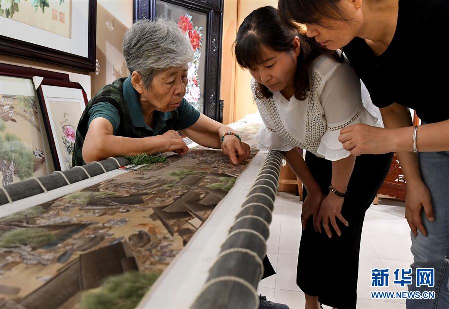 在開封市素花宋繡工藝有限公司的展示館里,王素花向徒弟劉冬紅講解刺繡作品上的難點(diǎn)(7月30日攝)。新華社記者李安攝