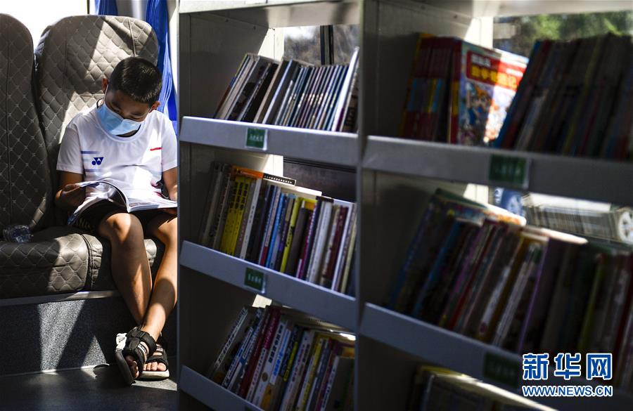 8月5日,一名小讀者在“流動圖書館”里看書。三千冊圖書,一輛大巴車,穿梭在城市的街頭巷尾。在吉林長春,長春市圖書館利用流動圖書車,定期在市內(nèi)15個固定服務點間巡回流動,為市民提供便捷的圖書借閱服務。新華社記者許暢攝