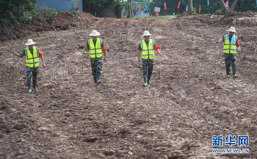 8月5日,夏德勤(左一)與同事在長江武金堤背水面巡查管涌情況。新華社記者肖藝九攝