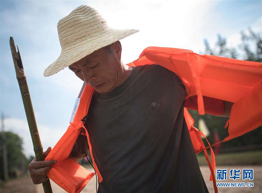 8月5日,夏德勤穿上救生衣準備去堤壩的迎水面巡查。新華社記者肖藝九攝