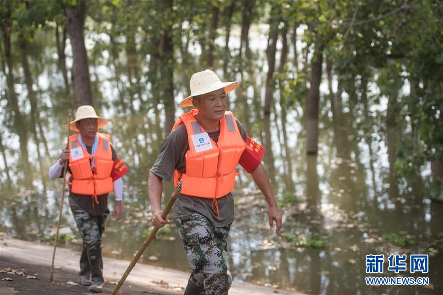 8月5日,夏德勤(左)與同事在長江武金堤上巡查。新華社記者肖藝九攝