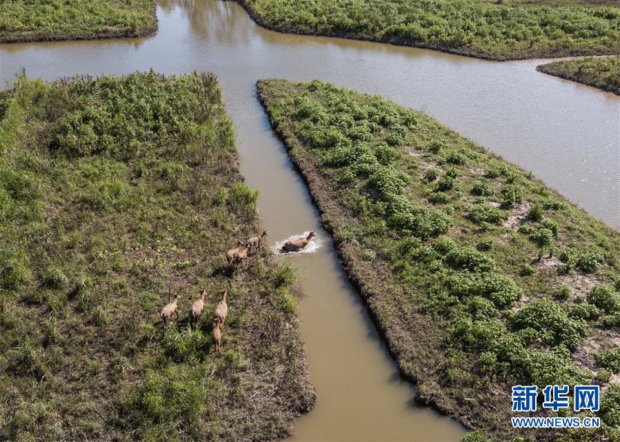 這是8月7日在東洞庭湖麋鹿和鳥類救治避難中心拍攝的麋鹿(無人機照片)。位于湖南省岳陽市的東洞庭湖麋鹿和鳥類救治避難中心成立于2016年9月,占地400余畝,中心自建成后就承擔(dān)起東洞庭湖區(qū)域全部麋鹿的救援、醫(yī)治、康復(fù)和喂養(yǎng)任務(wù)。目前該中心共有14只麋鹿正在接受救助。新華社記者李鑫攝
